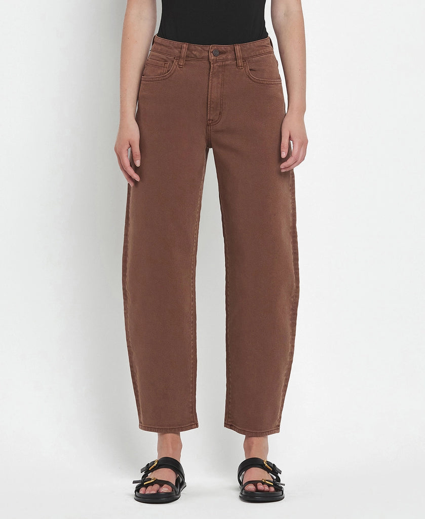 Discover the perfect blend of comfort and style with our Brown Barrel Jeans. Crafted from stretch denim, these jeans feature a super high-rise waist that enhances your silhouette. The slim barrel cut and cropped length create a sleek, modern look, while the finished hem adds a polished touch. Ideal for elevating your everyday outfits with ease and confidence.