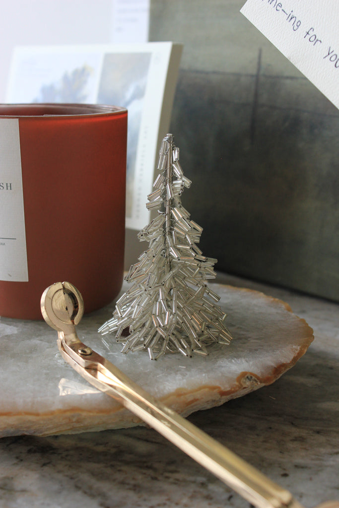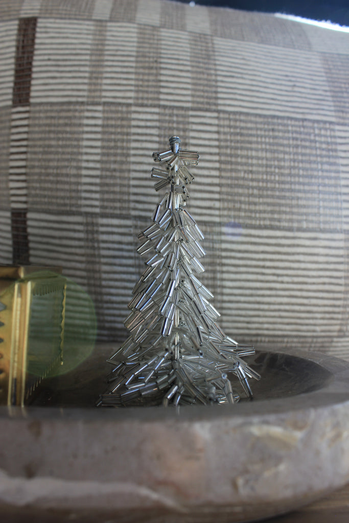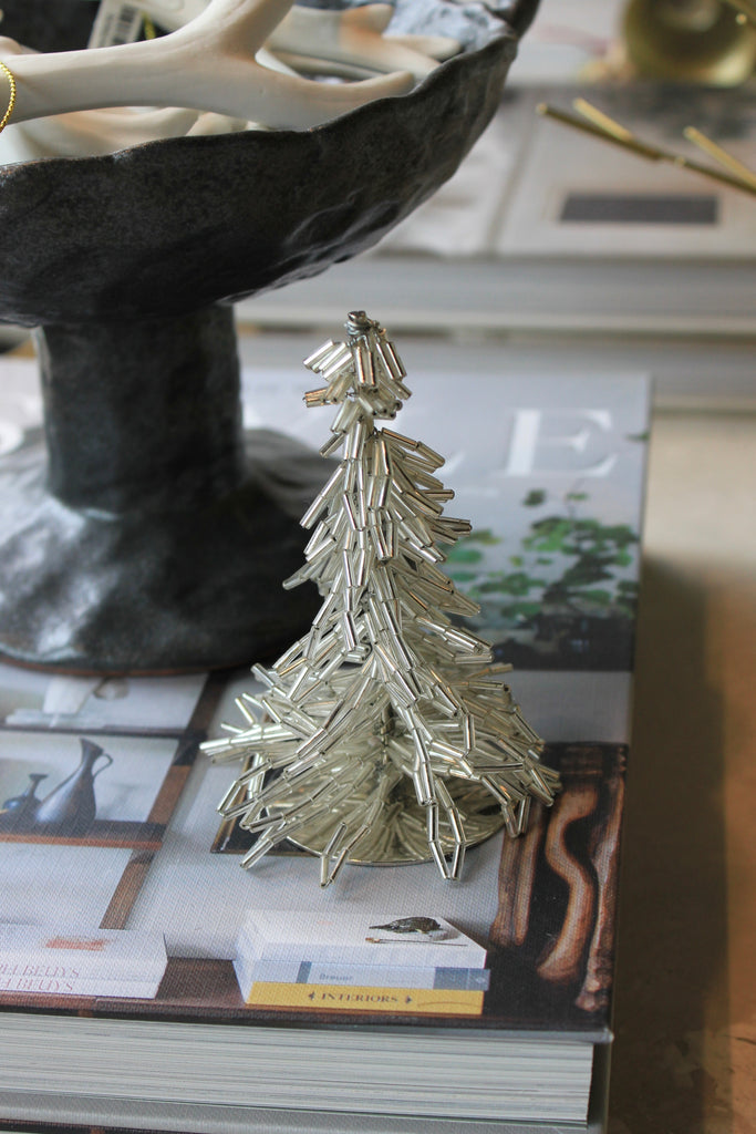 Introducing our Beaded Mini Tree, the perfect addition to your holiday décor. Crafted with intricate silver beading, this mini tree adds a touch of sparkle and elegance to any room. Bring the magic of the season into your home with this eye-catching piece.