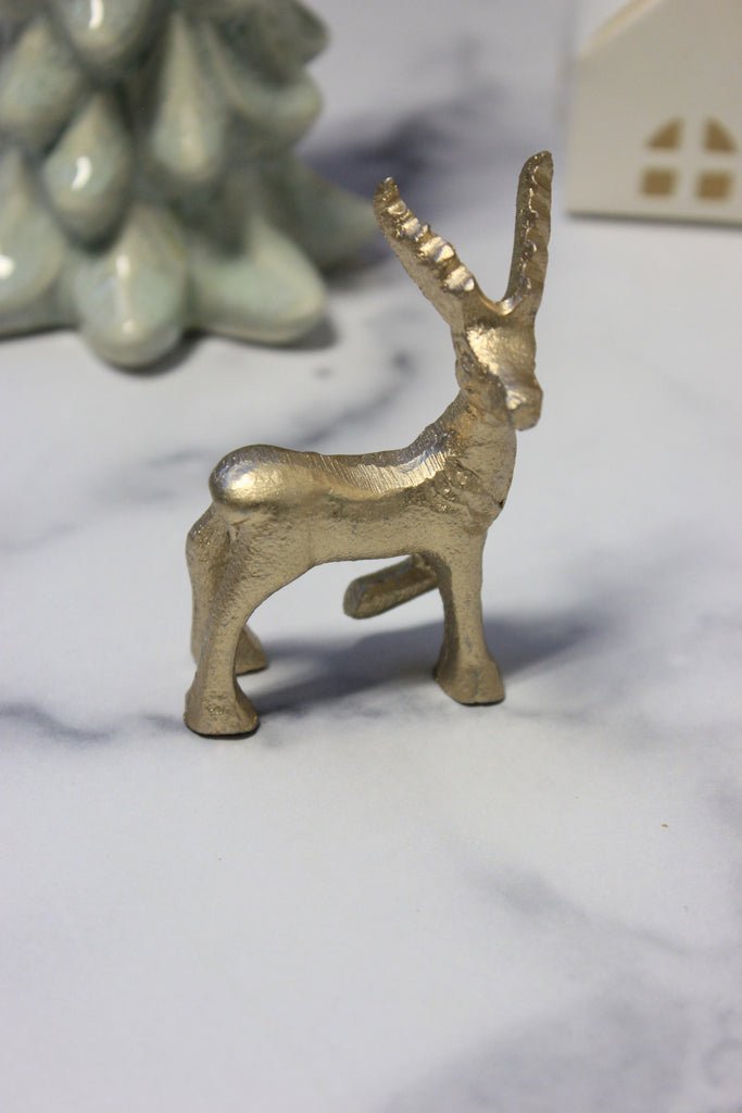 Crafted with expert precision, the Cast Aluminum Reindeer adds a touch of elegance to any holiday decor. Made of durable cast aluminum and finished in champagne, this reindeer statue is sure to impress. Elevate your festive ambiance with this exquisite piece.