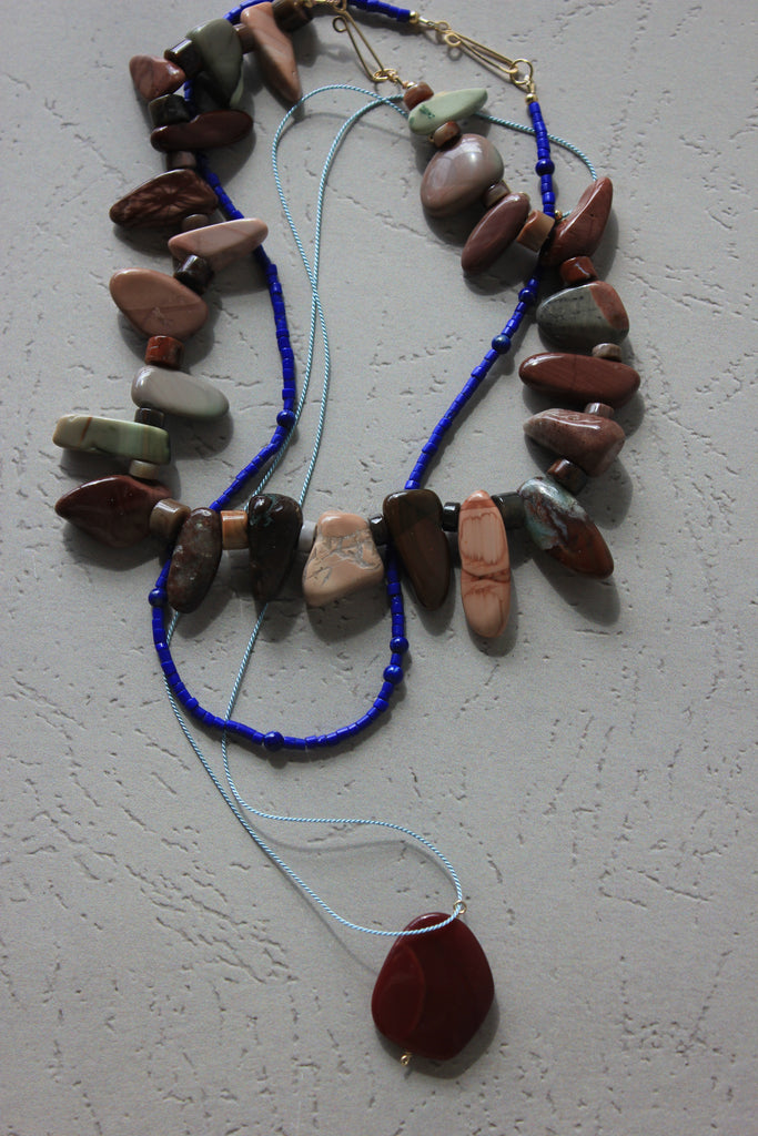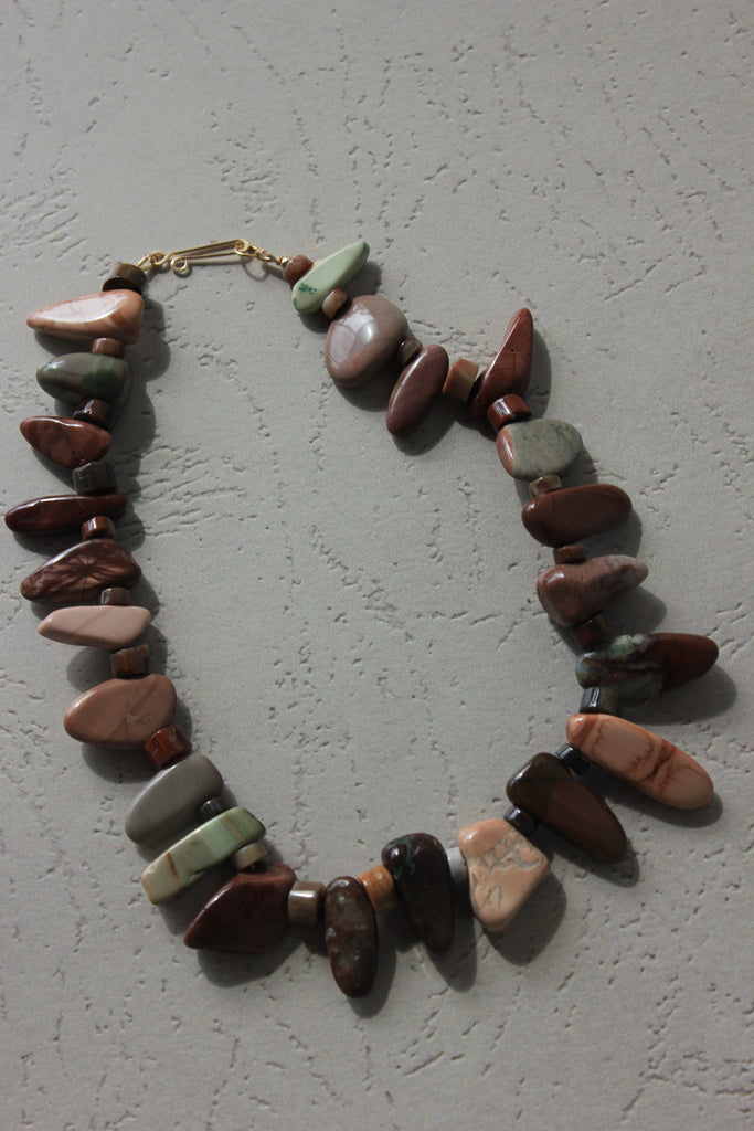 Elevate your collection with the one-of-a-kind Imperial Jasper Necklace from The Millhouse Collection. This unique piece features rich imperial jasper stones alternating with petrified wood, accented by gold-fill metal clasp. Crafted with care, it combines natural beauty and refined elegance to create a truly distinctive accessory that commands attention.
