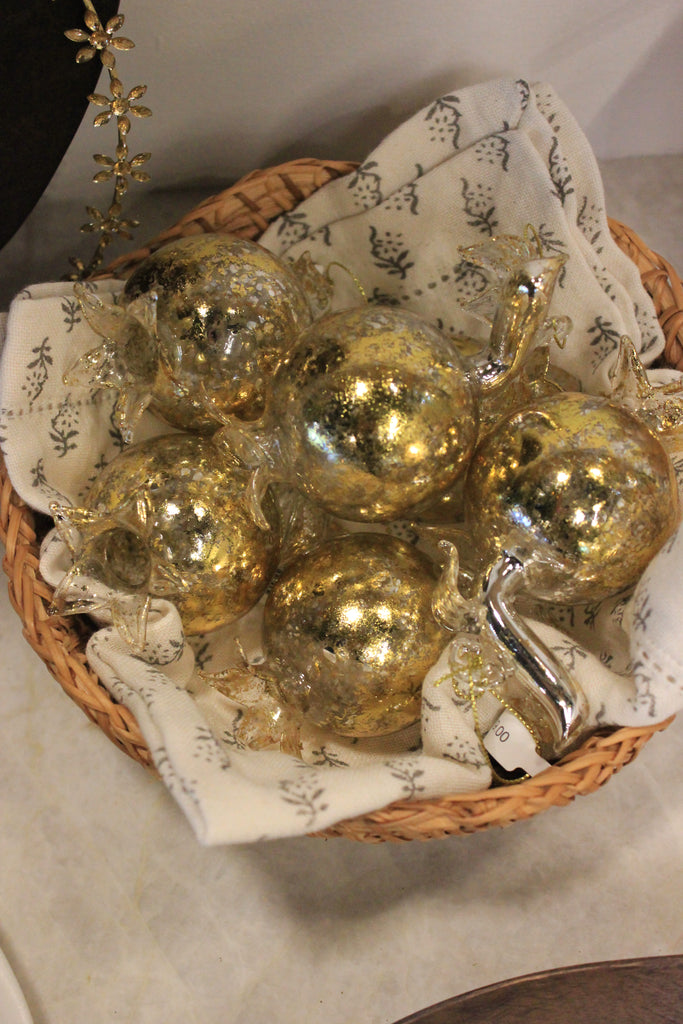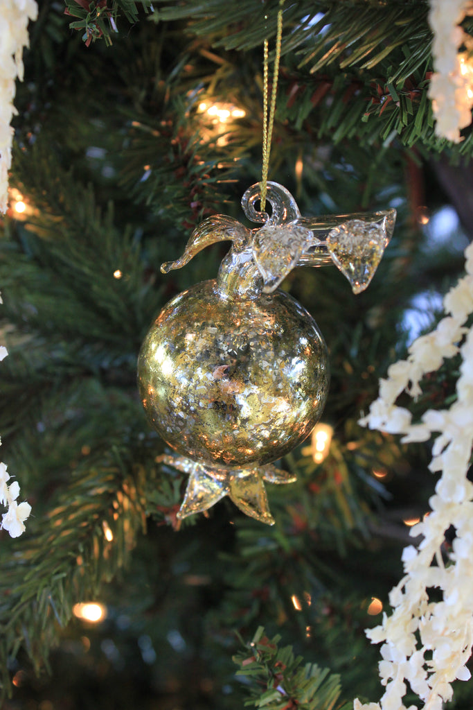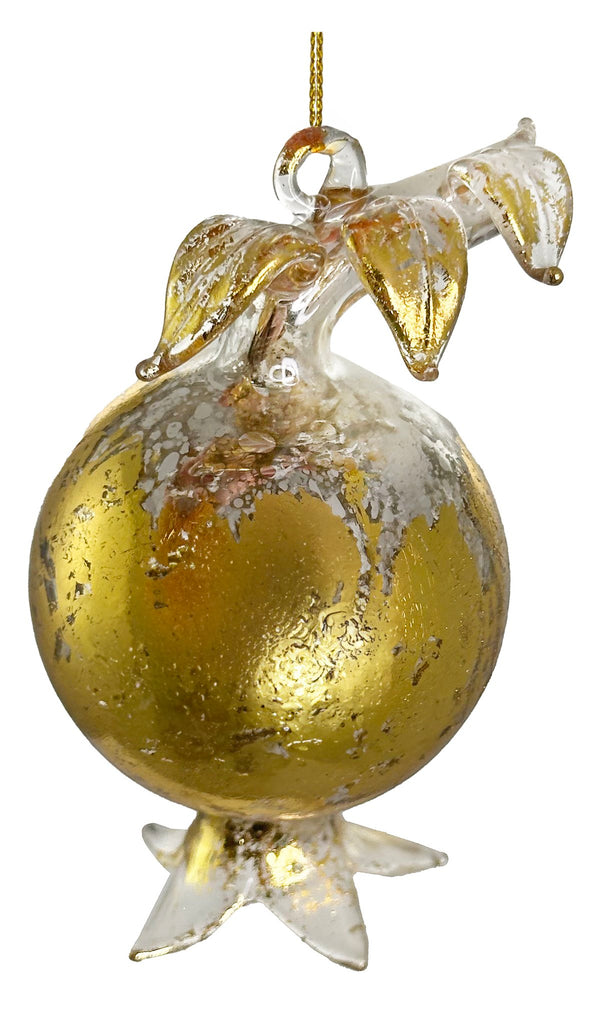 Handcrafted with care, this stunning glass pomegranate ornament adds a touch of elegance to any holiday decor. The intricate gilded design showcases expert craftsmanship and is sure to catch the eye of any guest. Made of durable glass, this timeless piece will be a cherished addition to your collection.