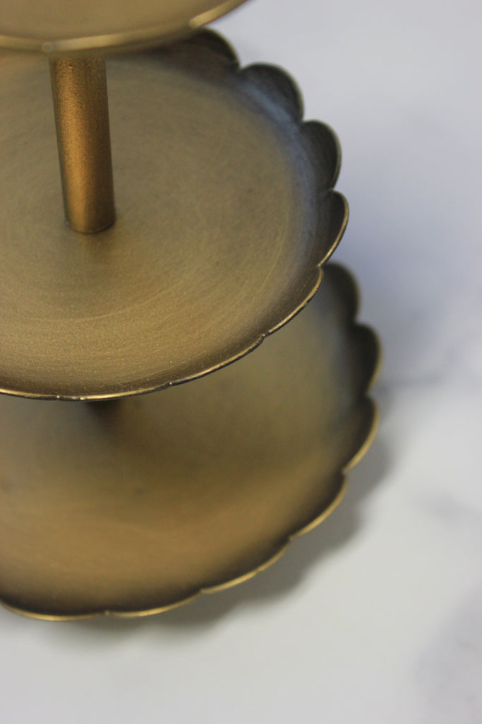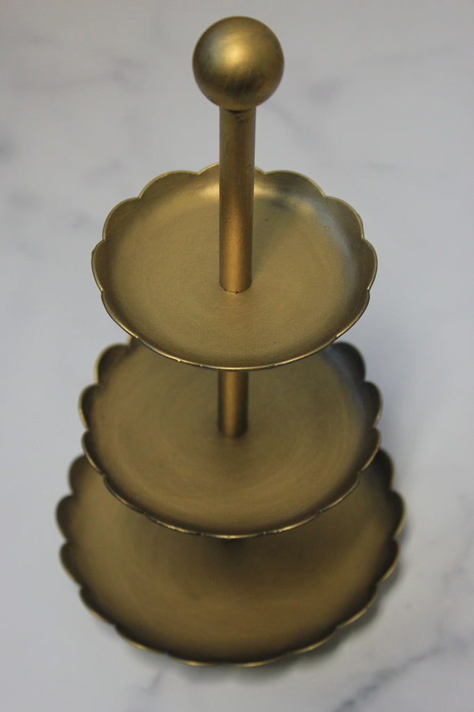 Elevate your organizing game with this elegant Metal 3-Tier Tray featuring scalloped edges and a rich gold finish. Its tiered design maximizes space, perfect for displaying jewelry or decor while adding a touch of sophistication to any room. Durable and stylish, this tray effortlessly combines function with a glamorous aesthetic.