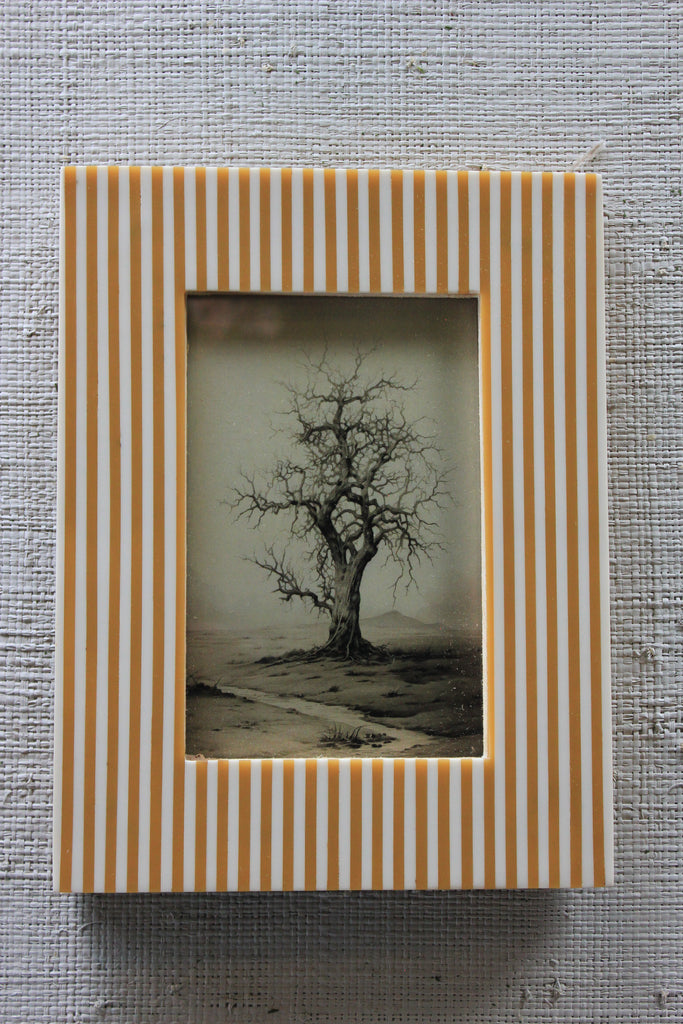 This handmade resin frame features a beautiful white and caramel stripe pattern that works well in any room. The durable construction protects your photos and artwork while adding a touch of elegance to your space. Perfect for displaying memories on shelves, desks, or walls. A timeless piece that complements both modern and traditional décor.