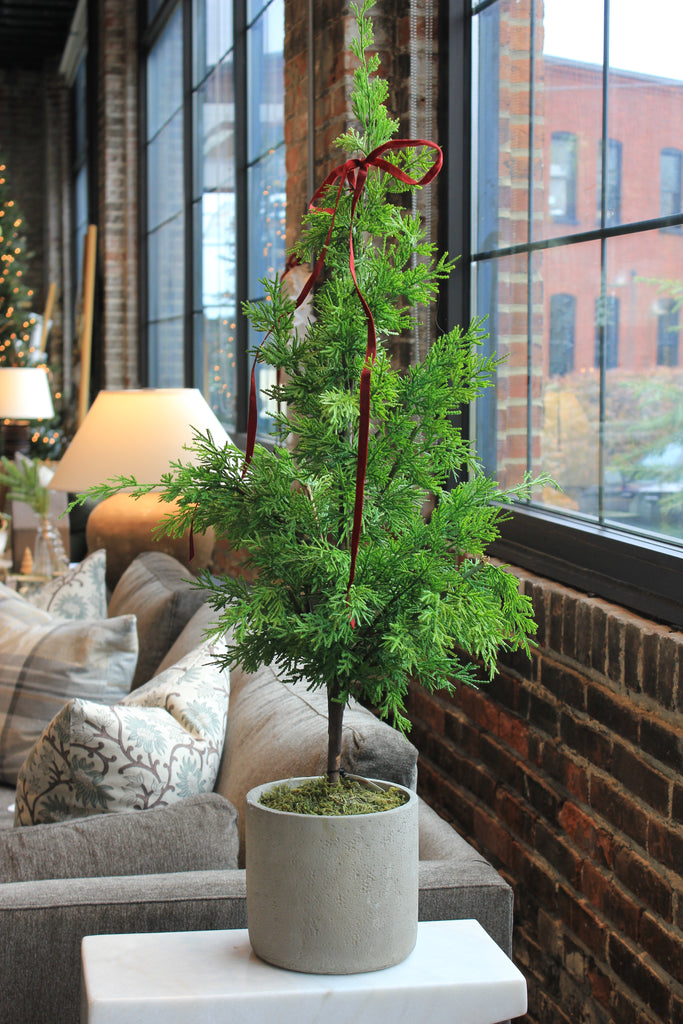 Bring the serene beauty of nature indoors with this striking Cedar Tree in a cement pot. The minimalist concrete vessel complements any décor style, from modern to rustic, while the lush greenery adds life and freshness to your space. Perfect for desks, shelves, or entryways, this low-maintenance plant thrives in various light conditions. Create a calming atmosphere and improve your indoor air quality with this timeless botanical accent that transforms any room into a peaceful sanctuary.