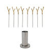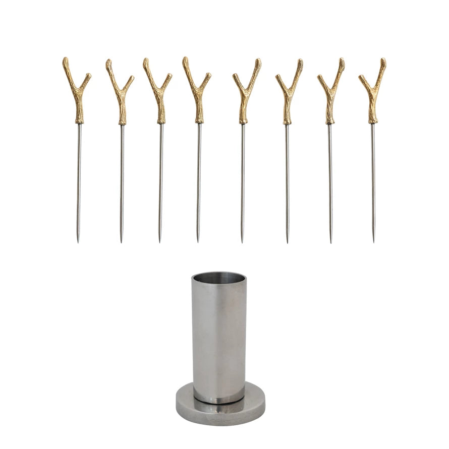 Elevate your next party with our Appetizer Picks w/ Brass Antler Handles set! Made with a sleek stainless steel holder and 8 stunning 4-3/4"L picks, our set adds a touch of sophistication to any gathering. The brass antler handles not only provide a unique aesthetic, but also make serving and picking up appetizers a breeze. Get ready to impress your guests and elevate your appetizers to a whole new level!