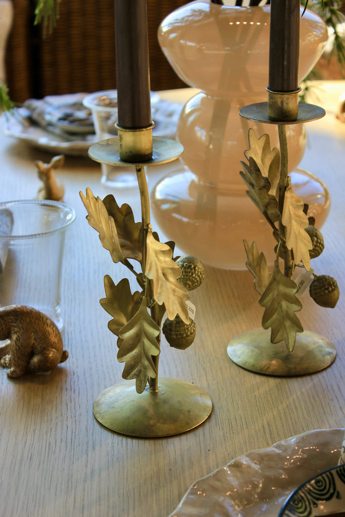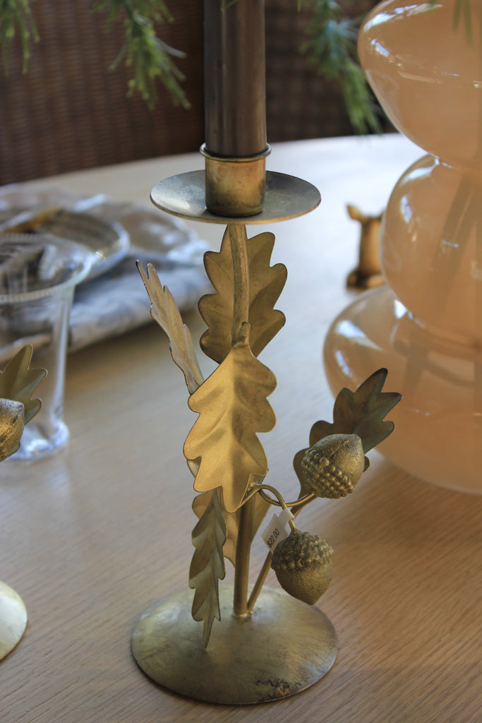 Add a touch of autumnal beauty to your home with our Handmade Metal Oak Leaves & Acorns Taper Holder. The antique gold finish adds warmth and elegance, while the intricate design of the leaves and acorns creates a stunning centerpiece for any room. Bring the beauty of fall indoors with this unique and charming piece.